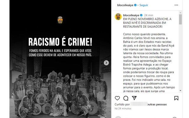 Artistas da banda do Ilê Aiyê, bloco afro mais antigo do país, teriam sido vítimas de racismo antes de uma apresentação em um restaurante de luxo na região do bairro do Comércio, em Salvador. O caso foi denunciado através de uma publicação em uma rede social, nesta quinta-feira (30).