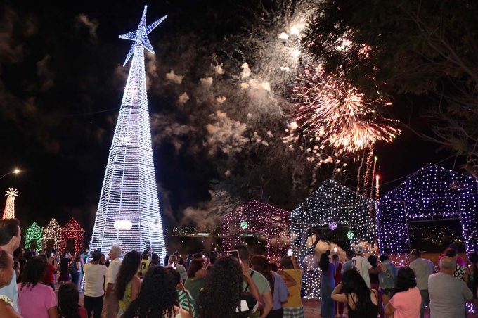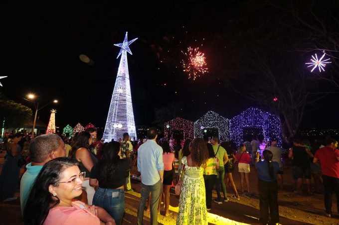 A Prefeitura de Vitória da Conquista inaugurou oficialmente, neste domingo (10), a ornamentação natalina do Parque Ambiental da Lagoa das Bateias. Ao entardecer, após uma rápida contagem regressiva, a prefeita Sheila Lemos acionou o controle remoto e as luzes foram finalmente acesas, sob o som dos fogos de artifício instalados num barco, bem no centro do espelho d’água.