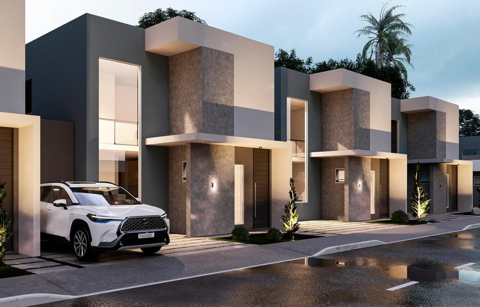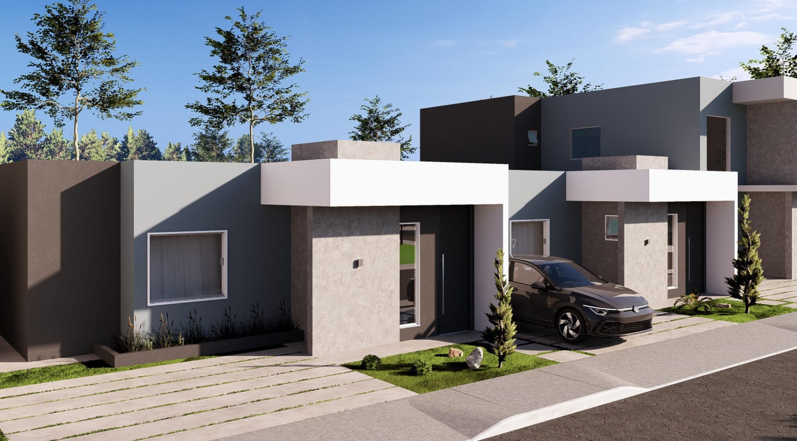 As casas podem ser construídas em dois formatos: um único pavimento, com três suítes, duas salas e pré-disposição para ampliação e construção do primeiro andar, ou duplex, que tem quatro suítes e três salas (jantar, tv e estar), além do home office. Independente da planta escolhida, o layout é otimizado para atender às necessidades de todos os moradores com área de serviço independente e um quintal espaçoso para celebrações em família ou entre amigos.