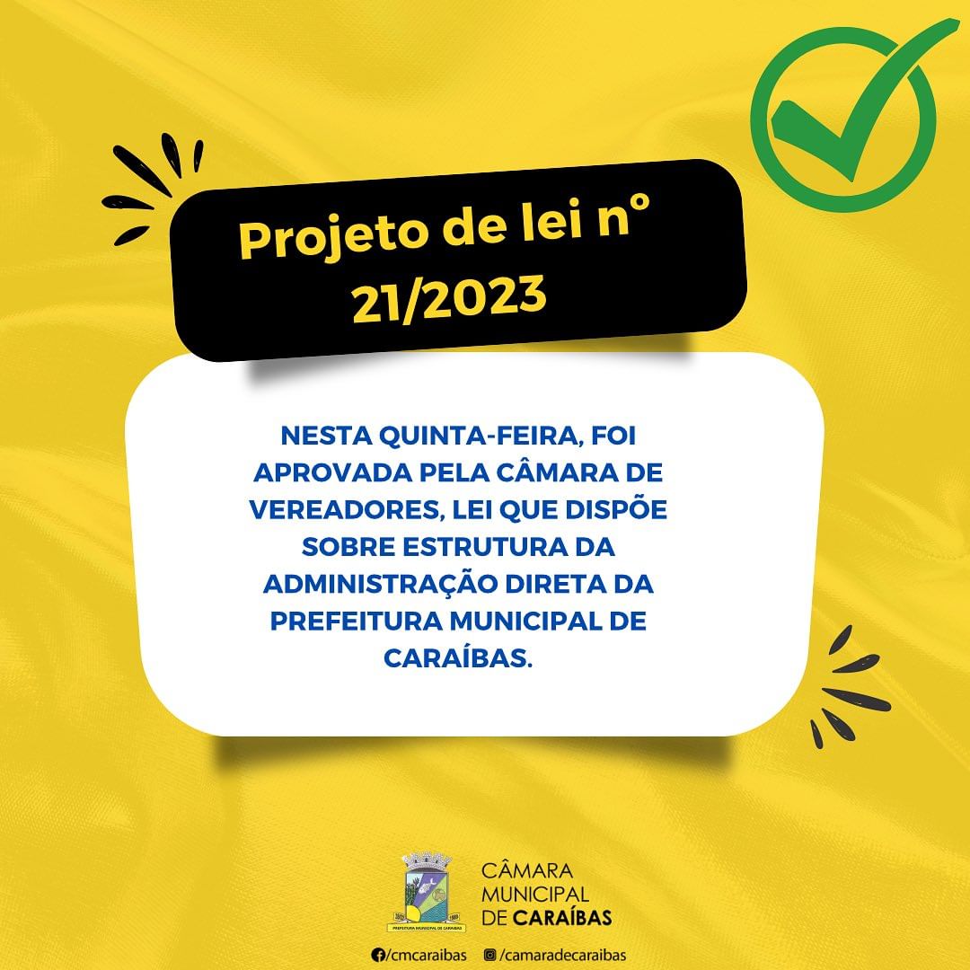 Na última quinta-feira (28), a Câmara Municipal de Caraíbas aprovou a Lei que dispõe sobre estrutura da administração direta da Prefeitura Municipal de Caraíbas, Projeto de Lei nº 21/2023.