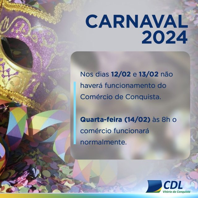 O comércio de Vitória da Conquista não funcionará na segunda-feira (12/02) e terça-feira (13/02) de Carnaval. No sábado (10/02) e na quarta-feira de cinzas (14/02) o comércio vai funcionar em horário normal, a partir das 8h.