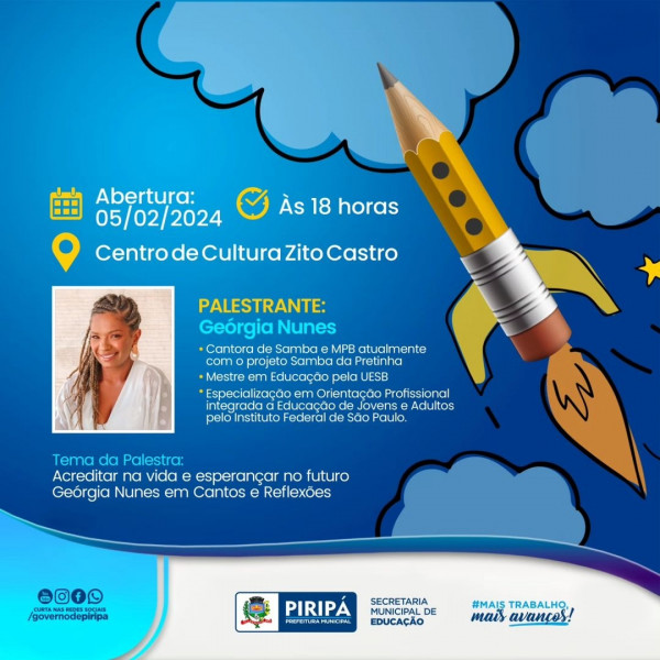 A Secretaria de Educação de Piripá inicia na próxima segunda-feira, 05/02, às 18h, no Centro de Cultura Zito Castro, a Jornada Pedagógica 2024, voltada para os profissionais da educação municipal. O evento marca a abertura oficial do ano letivo na Rede Municipal de Ensino. Confira!