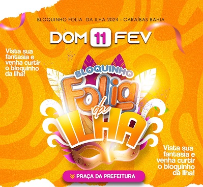 No domingo, 11 de Fevereiro, a Prefeitura de Caraíbas estará realizando o Bloquinho Folia da Ilha, na sede, a partir das 16h, na praça da prefeitura.