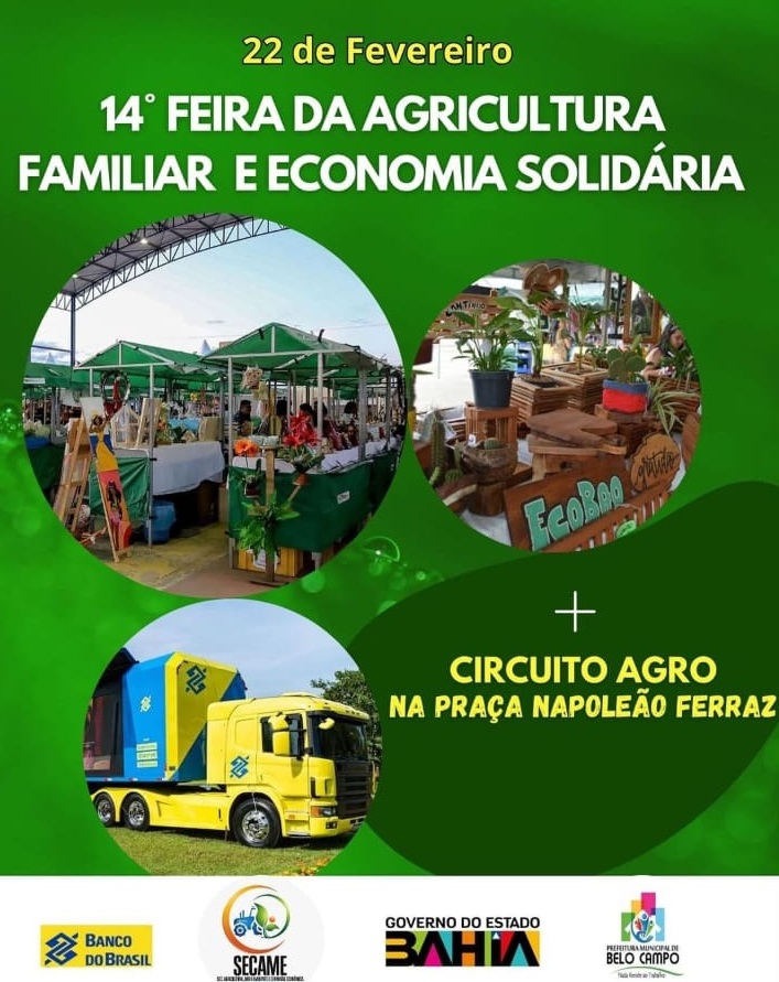 A Secretaria de Agricultura, Meio Ambiente e Expansão Econômica de Belo Campo está organizando a 14ª Feira da Agricultura Familiar e Economia Solidária, que acontecerá no dia 22/02, na próxima quinta-feira, na Praça Napoleão Ferraz. O evento também contará com o Circuito Agro do Banco do Brasil, proporcionando uma oportunidade única para os agricultores familiares e empreendedores da região.