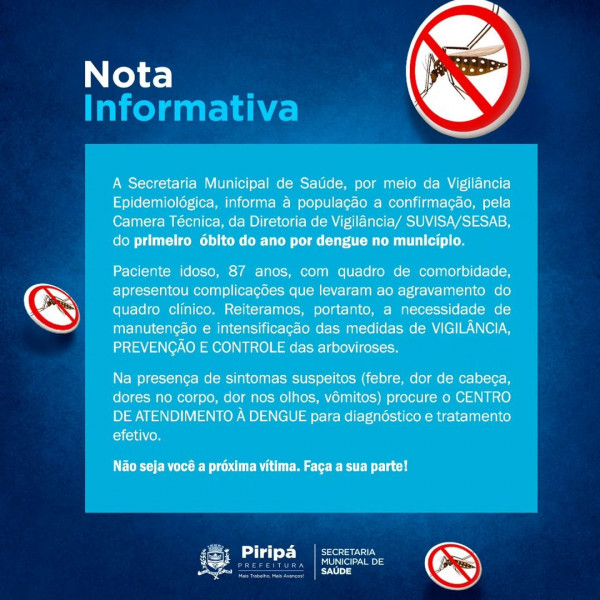 A Prefeitura de Piripá atraves da Secretaria Municde Saúde, por meio da Vigilância Epidemiológica, informa à população a confirmação, pela Camera Técnica, da Diretoria de Vigilância/ SUVISA/SESAB, do *primeiro óbito do ano por dengue no município*.