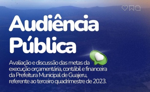 É com grande honra que o Governo de Guajeru, por meio da Secretaria Municipal de Administração, convida a todos os interessados para participar da Audiência Pública destinada à apresentação, análise e discussão das metas de execução orçamentária, contábil e financeira da Prefeitura Municipal de Guajeru, referentes ao terceiro quadrimestre de 2023.