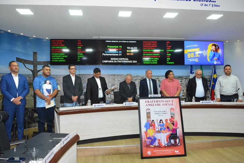 Na noite desta terça-feira, 27, foi realizada na Câmara Municipal de Vitória da Conquista, a Sessão Especial em comemoração a Campanha da Fraternidade 2024. Esse ano, a campanha tem como tema Fraternidade e Amizade Social e é promovida pela Conferência Nacional dos Bispos do Brasil (CNBB). A sessão no Legislativo Municipal está prevista na na Lei número 2.081 de 2016 e desde então é realizada todos os anos em parceria com a igreja católica. Além dos parlamentares e representantes da igreja, autoridades e representantes da comunidade participaram do encontro.