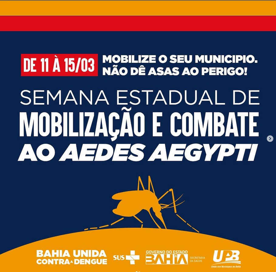 Tem início nesta segunda-feira (11) e segue até o dia 15 de março a Semana de Mobilização contra a dengue. A ação promovida pela Secretaria de Saúde do Estado (Sesab) tem o objetivo de prevenir a dengue e combater o mosquito Aedes aegypti em feiras, metrôs, comunidades e com reforço à orientação sobre manejo clínico.