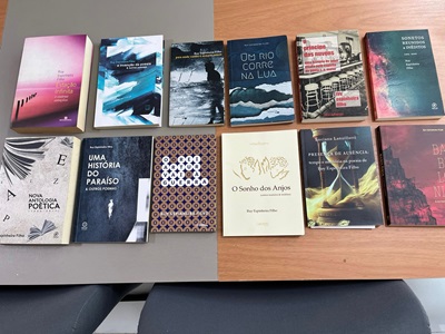 Para a Biblioteca do Jornalista Baiano, das suas dezenas de obras, Ruy Espinheira ofertou 11 exemplares de seus livros: “Estação Infinita e Outras Estações”, 2012; “O Sonho dos Anjos”, 2014; “O Príncipe das Nuvens”, 2016; “Babilônia & Outros Poemas”, 2017; “Nova Antologia Poética”, 2018; “O Rei Artur Vai à Guerra”, 2019; “Uma História do Paraíso & Outros Poemas”, 2019; “Para Onde Vamos é Sempre Ontem”, 2020; “Sonetos Reunidos e Inéditos”, 2020; “Um Rio Corre na Lua”, 2022; “A Invenção da Poesia & Outros Poemas”, 2023. Completa o lote, o ensaio de Luciano Lanzillotti “Presença de Ausência: Tempo e Memória na Poesia de Ruy Espinheira Filho, 2023”.