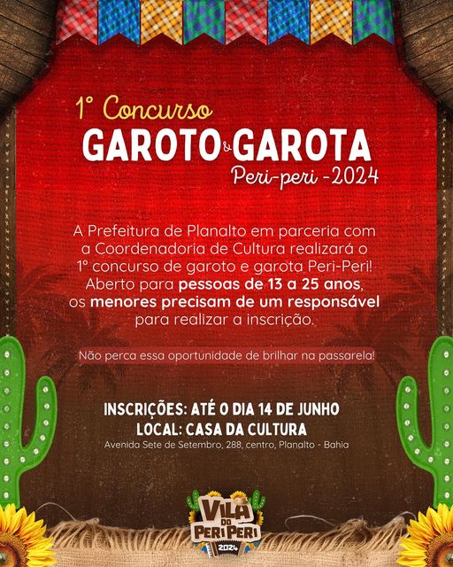 A Prefeitura de Planalto, através da Coordenadoria de Cultura, tem o prazer de anunciar o aguardado Desfile Garoto e Garota PeriPeri 2024. O evento, que promete ser uma celebração inesquecível de beleza, estilo e cultura, acontecerá na charmosa Vila do PeriPeri durante o período junino.