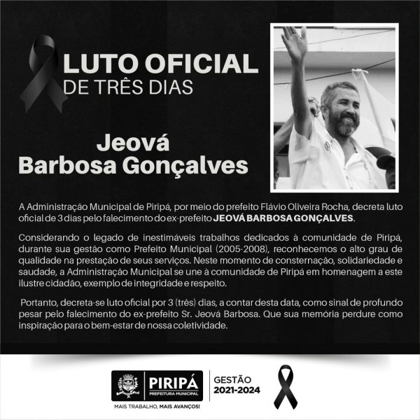 A Administração Municipal de Piripá, por meio do prefeito Flávio Oliveira Rocha, decreta luto oficial de 3 dias pelo falecimento do ex-prefeito JEOVÁ BARBOSA GONÇALVE. Considerando o legado de inestimáveis trabalhos dedicados à comunidade de Piripá, durante sua gestão como Prefeito Municipal (2005-2008), reconhecemos o alto grau de qualidade na prestação de seus serviços. Neste momento de consternação, solidariedade e saudade, a Administração Municipal se une à comunidade de Piripá em homenagem a este ilustre cidadão, exemplo de integridade e respeito. Portanto, decreta-se luto oficial por 3 (três) dias, a contar desta data, como sinal de profundo pesar pelo falecimento do ex-prefeito Sr. Jeová Barbosa. Que sua memória perdure como inspiração para o bem-estar de nossa coletividade. #Luto
