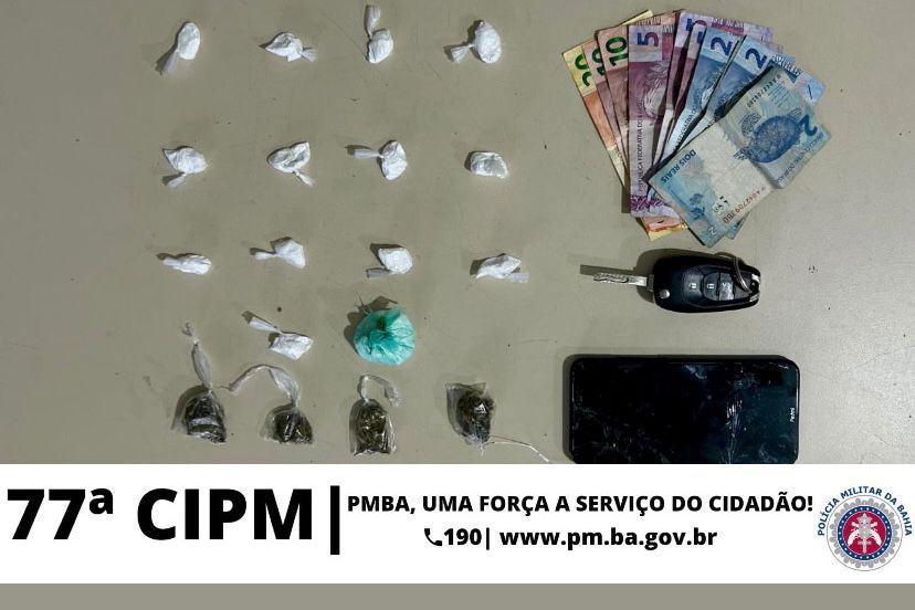 Os materiais apreendidos incluíram 15 porções de uma substância similar à cocaína, 04 petecas de substância similar à maconha, além de R$ 58,00 em dinheiro, um aparelho celular e um veículo.