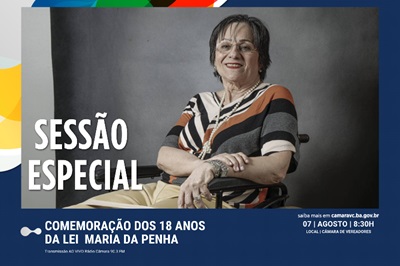 Na manhã desta quarta-feira, 7, às 8h30, a Câmara Municipal de Vitória da Conquista (CMVC) promove uma Sessão Especial para comemorar o 18º aniversário da Lei Maria da Penha. A audiência será realizada no Plenário Carmen Lúcia.