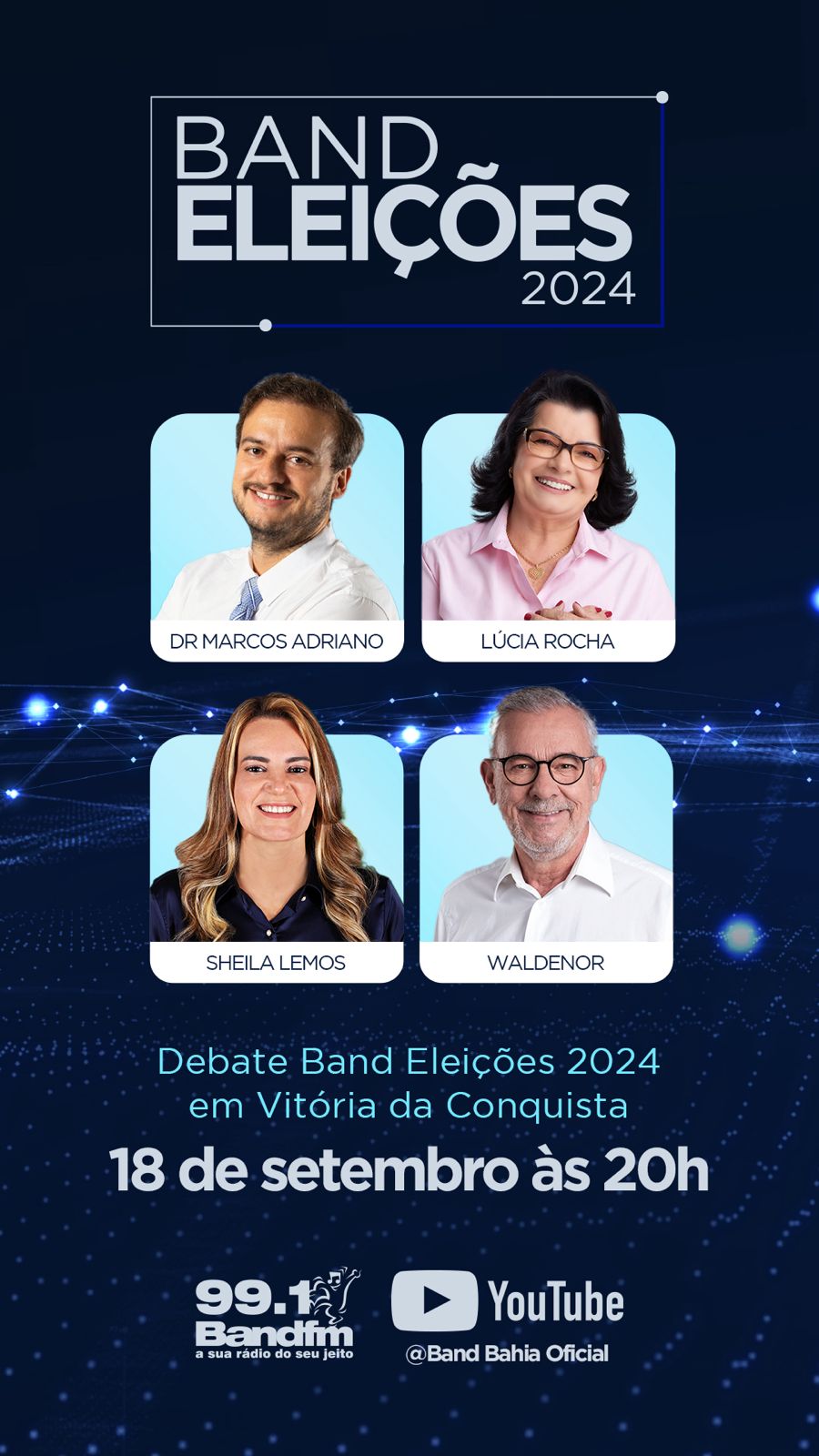 Os candidatos à Prefeitura de Vitória da Conquista, Lúcia Rocha, Marcos Adriano, Sheila Lemos e Waldenor Pereira, confirmaram presença no debate promovido pela Band FM 99,1. O evento está agendado para esta quarta-feira, 18 de setembro, às 20h, e será transmitido ao vivo pelo canal oficial da Band Bahia no YouTube (https://www.youtube.com/c/BandBahiaoficial).