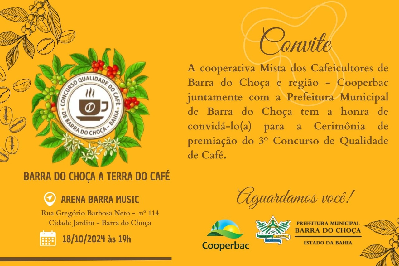 A Cooperativa Mista dos Cafeicultores de Barra do Choça e região LTDA – Cooperbac, juntamente com a Prefeitura Municipal de Barra do Choça estará realizando a terceira edição do Concurso de Qualidade de Café para os(as) produtores(as) do município.