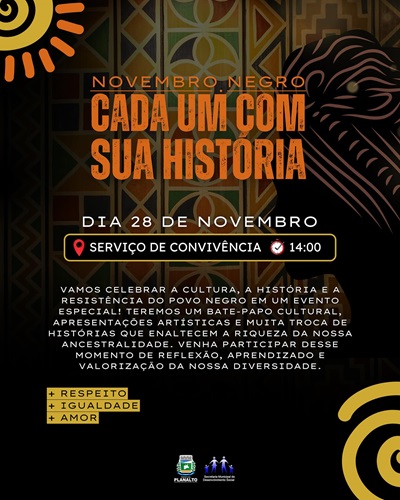 No próximo dia 28 de novembro, a Prefeitura de Planalto, por meio de sua Secretaria de Assistência Social, realizará um evento especial em alusão ao Novembro Negro. A programação será realizada às 14h, no Serviço de Convivência, e promete ser uma oportunidade única de reflexão, aprendizagem e valorização da cultura afro-brasileira.