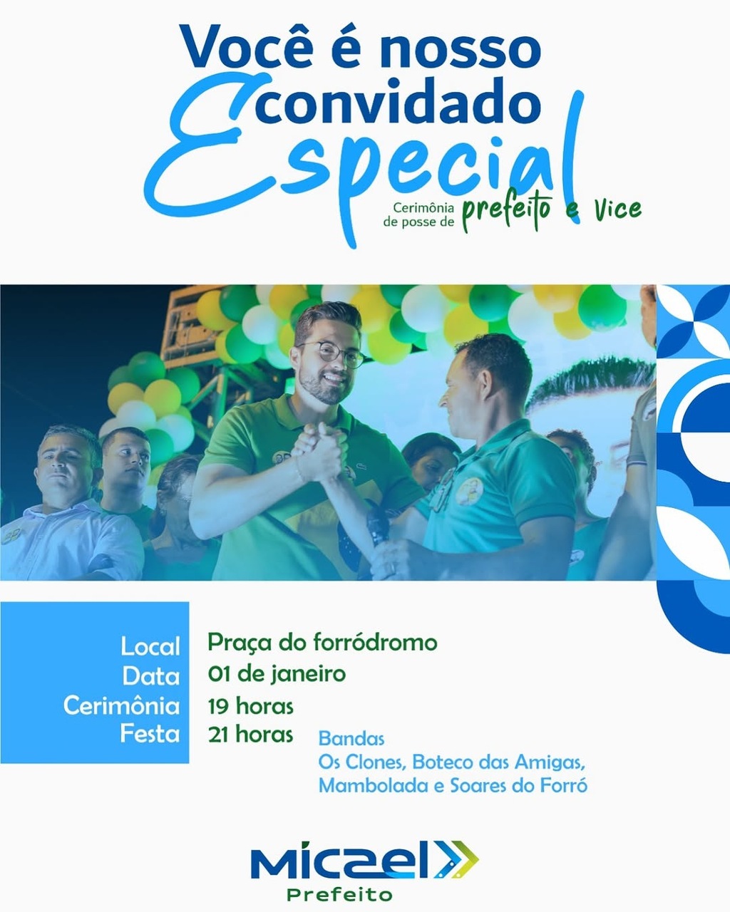 Micael convida todos os condeubenses a participarem deste momento especial. “É com muita emoção que convido você para a minha posse como prefeito de Condeúba, ao lado do vice Carlito e dos vereadores eleitos. Sua presença é essencial neste momento tão importante para nossa cidade. Vamos celebrar juntos o início de um novo ciclo de esperança e progresso!”, declarou Micael.