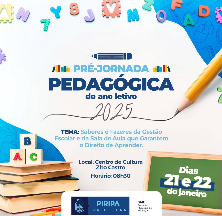 A Prefeitura de Piripá, por meio da Secretaria Municipal de Educação (SME), realiza nos dias 21 e 22 de janeiro a Pré-Jornada Pedagógica 2025, evento que reunirá gestores escolares e coordenadores pedagógicos para discutir as estratégias educacionais do município para o ano letivo de 2025. O encontro ocorrerá no Centro de Cultura Zito Castro, a partir das 08h30.