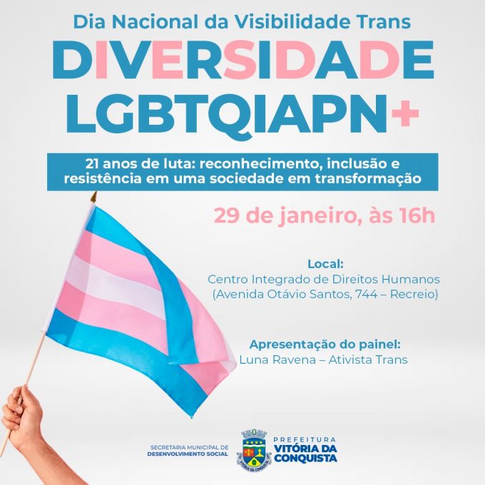 Para marcar o Dia Nacional da Visibilidade Trans, a Prefeitura de Vitória da Conquista, por meio da Coordenação de Promoção da Cidadania e Direitos de LGBT, vinculada à Secretaria Municipal de Desenvolvimento Social (Semdes), realizará nesta quarta-feira (29), a roda de conversa “Diversidade LGBTQIAPN+: 21 anos de luta, reconhecimento, inclusão e resistência em uma sociedade em transformação”. A atividade acontecerá às 16h, no Centro Integrado de Direitos Humanos (CIDH).
