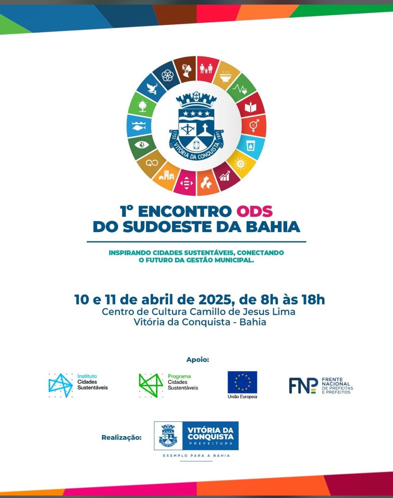 A Prefeitura de Vitória da Conquista realiza nos dias 10 e 11 de abril, o 1º Encontro ODS do Sudoeste da Bahia, com o tema “Inspirando Cidades Sustentáveis, Conectando o futuro da Gestão Municipal”. A estimativa é reunir 80 municípios das regiões Sudoeste, Médio Sudoeste, Rios de Contas e do Norte de Minas Gerais a fim de promover a troca de experiências entre gestores públicos, especialistas e instituições que atuam no desenvolvimento sustentável, fornecendo capacitação técnica e construção de redes de colaboração para que os municípios alcancem os Objetivos de Desenvolvimento Sustentável (ODS) para um mundo melhor até 2030.