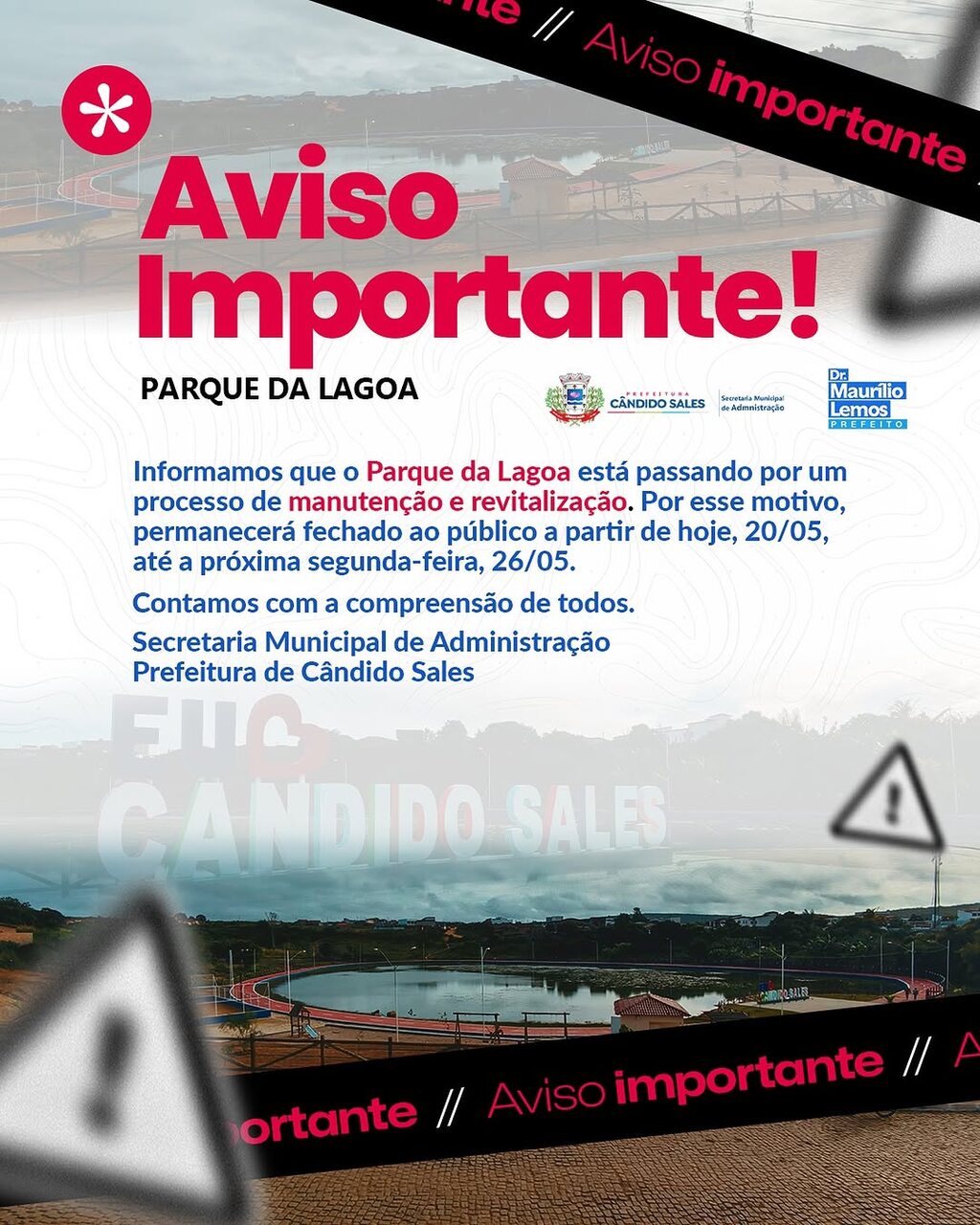 A Prefeitura de Cândido Sales, por meio da Secretaria Municipal de Administração, informa à população que o Parque da Lagoa estará temporariamente fechado para manutenção e revitalização no período de 20 a 26 de maio.