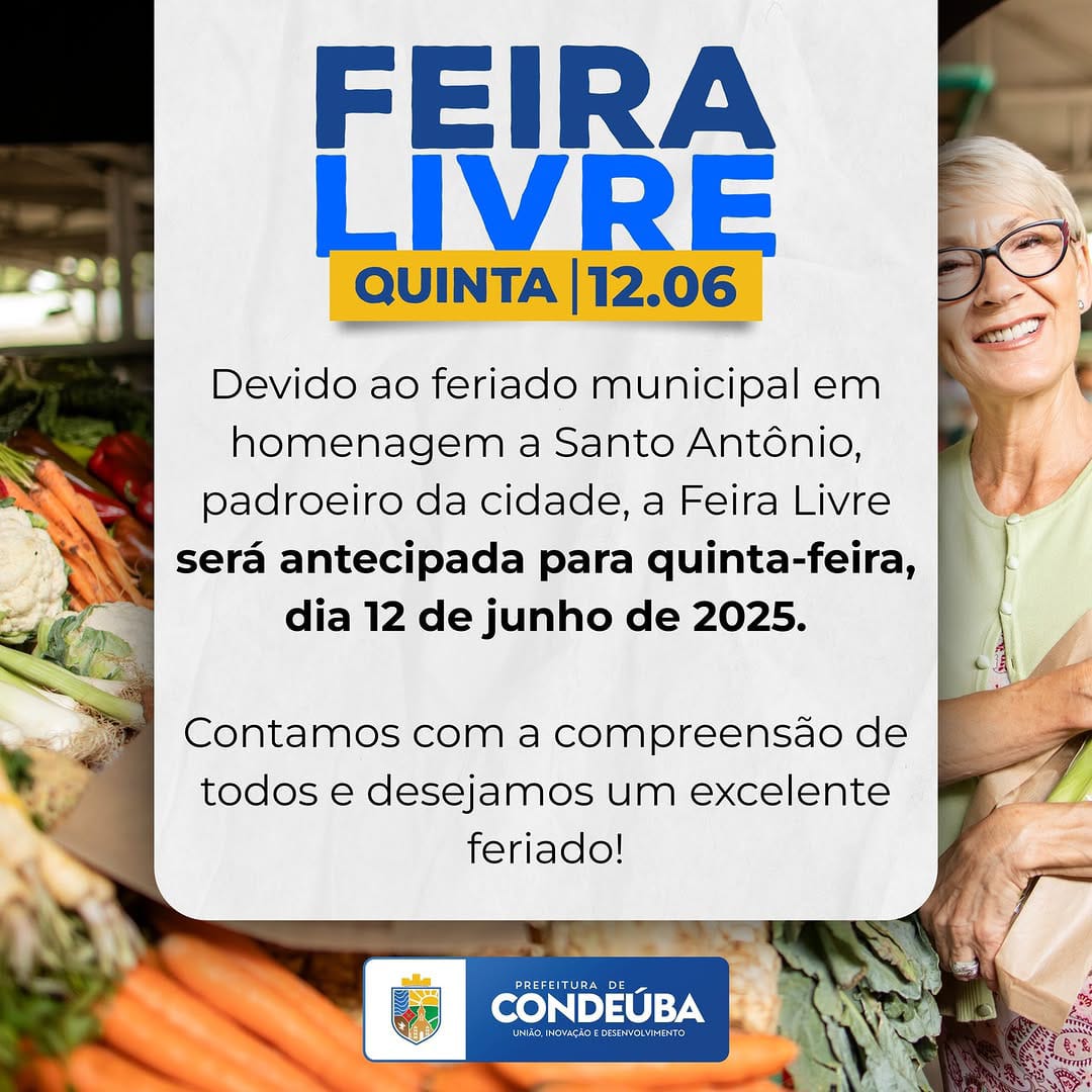 A Prefeitura de Condeúba informa a toda a população que, em razão do feriado municipal em homenagem a Santo Antônio, padroeiro da nossa cidade, a tradicional Feira Livre será antecipada para a próxima quinta-feira, dia 12 de junho.
