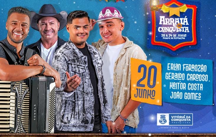 E vai ter forró para dançar até o sol raiar de 20 a 24 de junho, no Arraiá da Conquista. E quem abre os festejos juninos é Marquinhos Café, artista pernambucano que compõe, toca e canta o forró tradicional, trazendo uma melodia suave e aconchegante que tira o público para dançar. Pouco antes das 21h, sobe ao palco o conquistense Erlan Forrozão com seu estilo musical que mescla a releitura de clássicos do forró com sofrência, arrocha e piseiro.