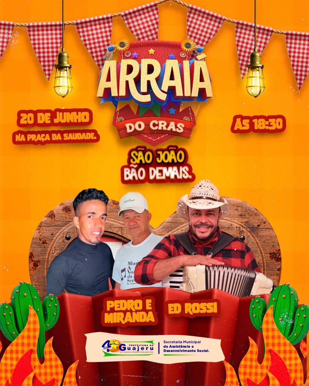 A cidade de Guajeru já entra no clima das festas juninas e convida toda a população para uma noite especial de celebração da cultura nordestina. Na próxima sexta-feira, 20 de junho, a partir das 18h30, a Prefeitura Municipal de Guajeru, por meio da Secretaria Municipal de Assistência e Desenvolvimento Social, realiza o tradicional Arraiá do CRAS, na Praça da Saudade.