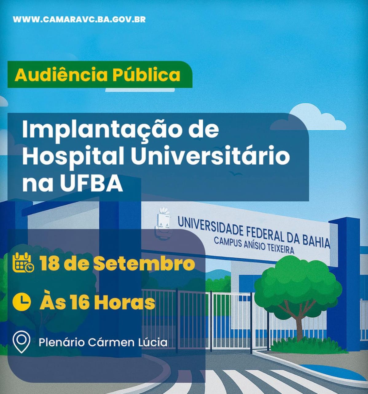 A Câmara Municipal realiza hoje, às 16h, audiência pública para debater a implantação de um Hospital Universitário (HU) no Campus Anísio Teixeira da Universidade Federal da Bahia (UFBA), em Vitória da Conquista.