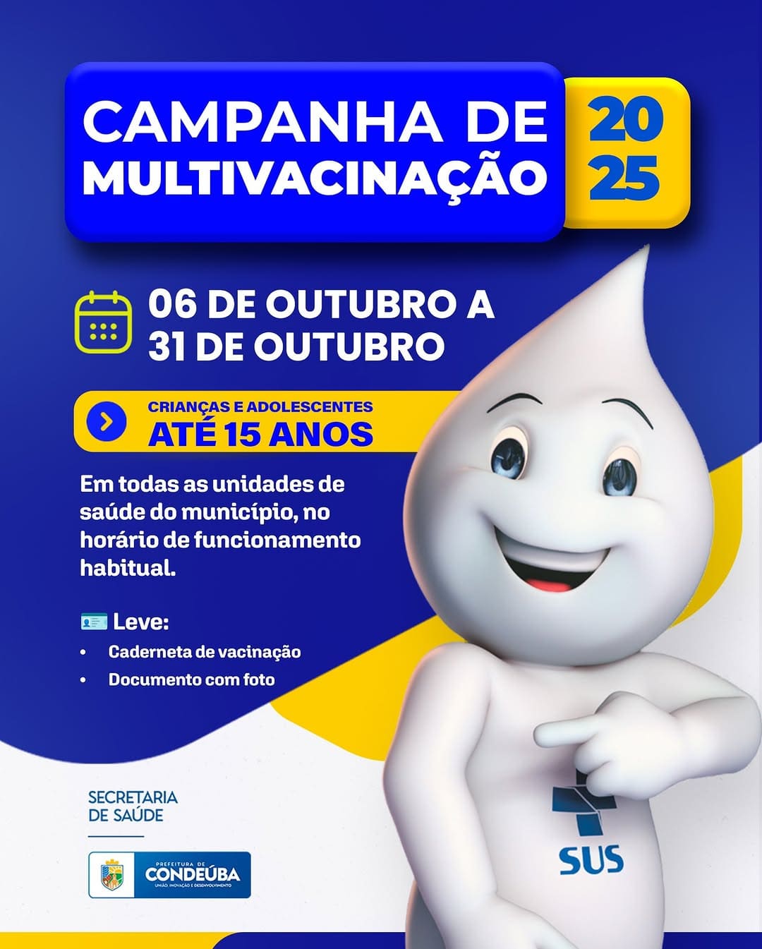 De 06 a 31 de outubro, todas as unidades de saúde do município de Condeúba estarão mobilizadas para a Campanha de Multivacinação, destinada a crianças e adolescentes de até 15 anos de idade.