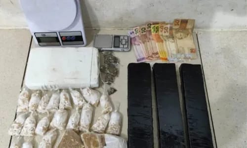 Além disso, também foram encontrados uma arma de fogo, duas balanças de precisão, R$ 433,00 em espécie e um par de placas de colete antibalístico.