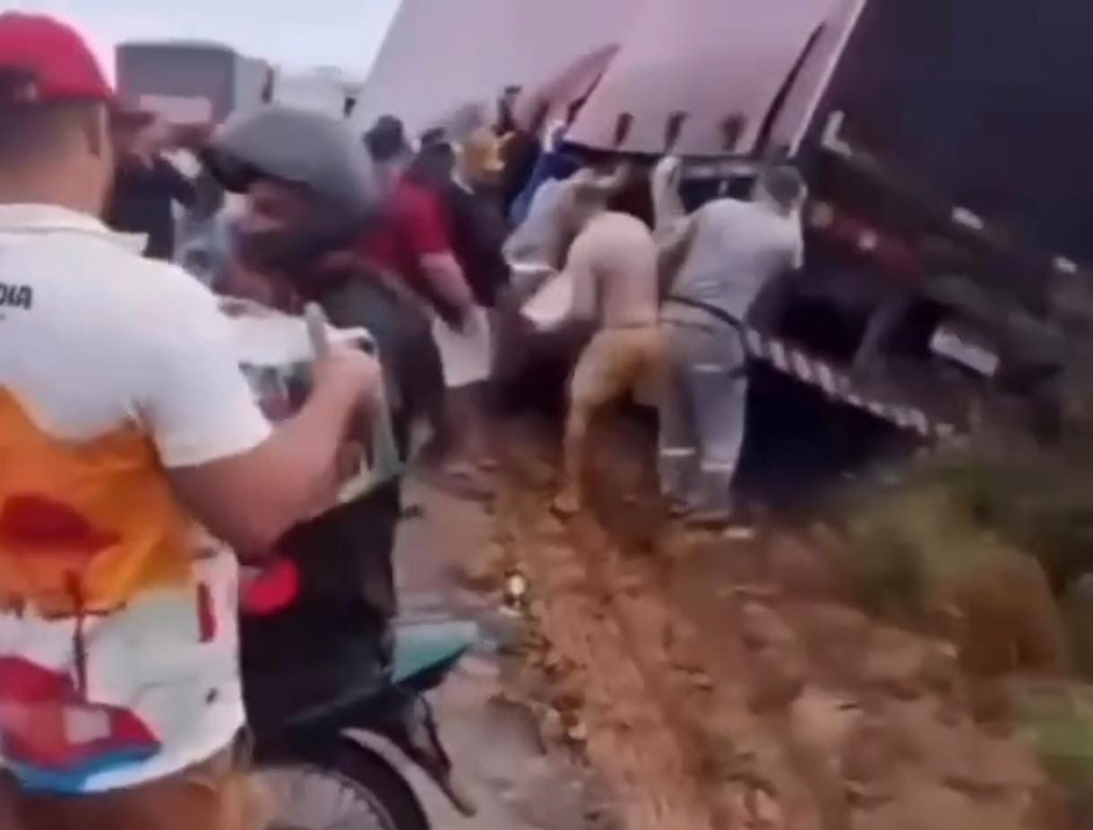 As imagens do acidente e do saque estão circulando nas redes sociais e mostram a cena caótica no local.