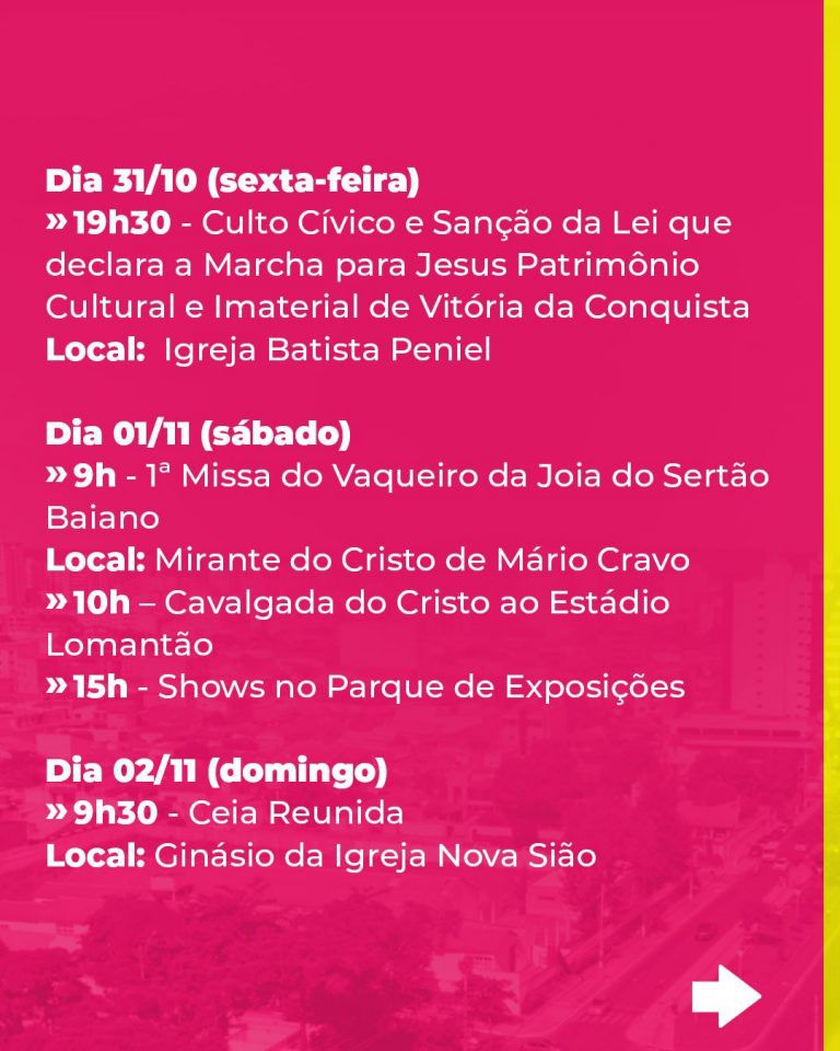 Novembro é mês de celebração pelos 185 anos de emancipação política de Vitória da Conquista. A data oficial é dia 9, mas as atividades comemorativas começam hoje (31), com o Culto Cívico de Abertura da Semana da Cultura Evangélica, na Igreja Batista Peniel, e seguem neste sábado com a realização da 1ª Missa do Vaqueiro, na área do Cristo de Mário Cravo. Outras ações estão programadas para o mês de aniversário do município.