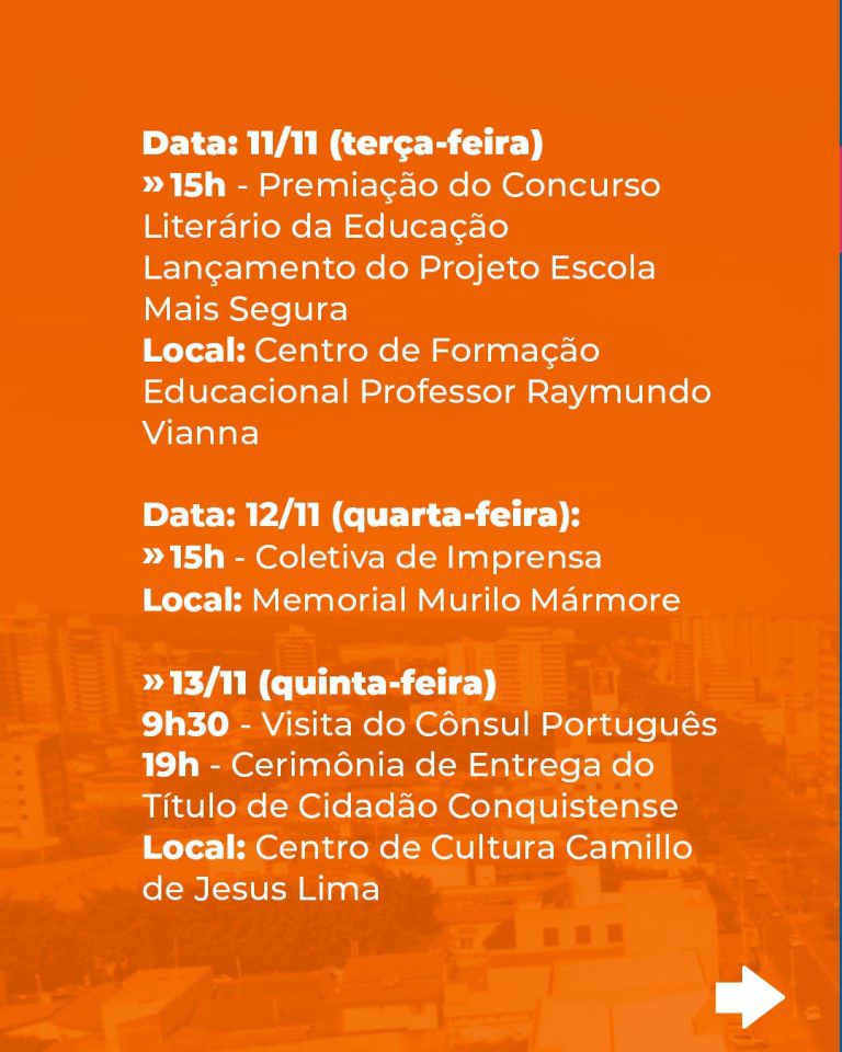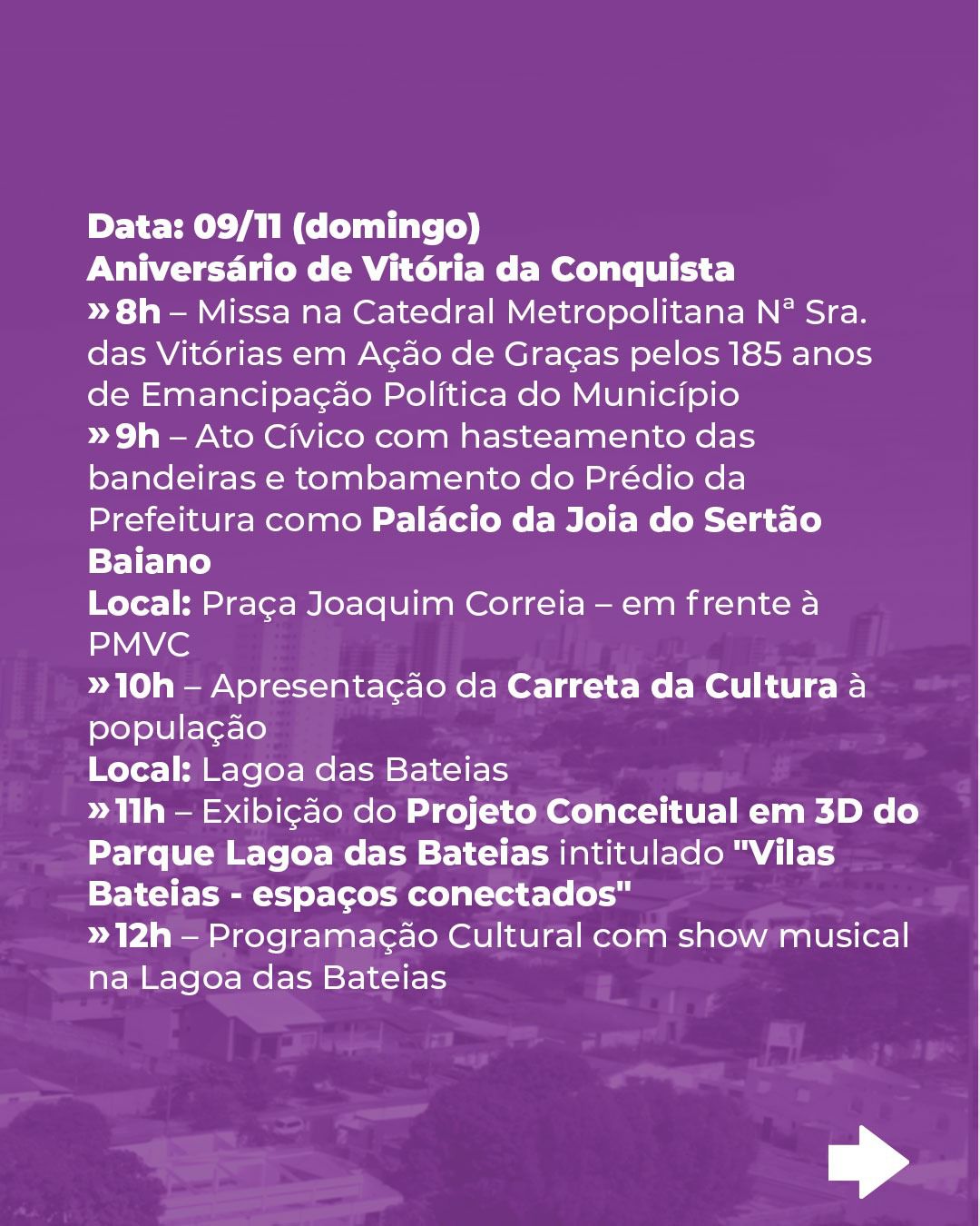 Segundo a prefeita Sheila Lemos, Vitória da Conquista é a melhor cidade para se viver na Bahia, uma cidade segura, desenvolvida e de povo ordeiro que orgulha conquistenses e conquistados. “Somos não apenas orgulho para a Bahia, somos orgulho para todo o Brasil, e de um modo geral temos muitos motivos para celebrar o aniversário da nossa Joia do Sertão Baiano”.