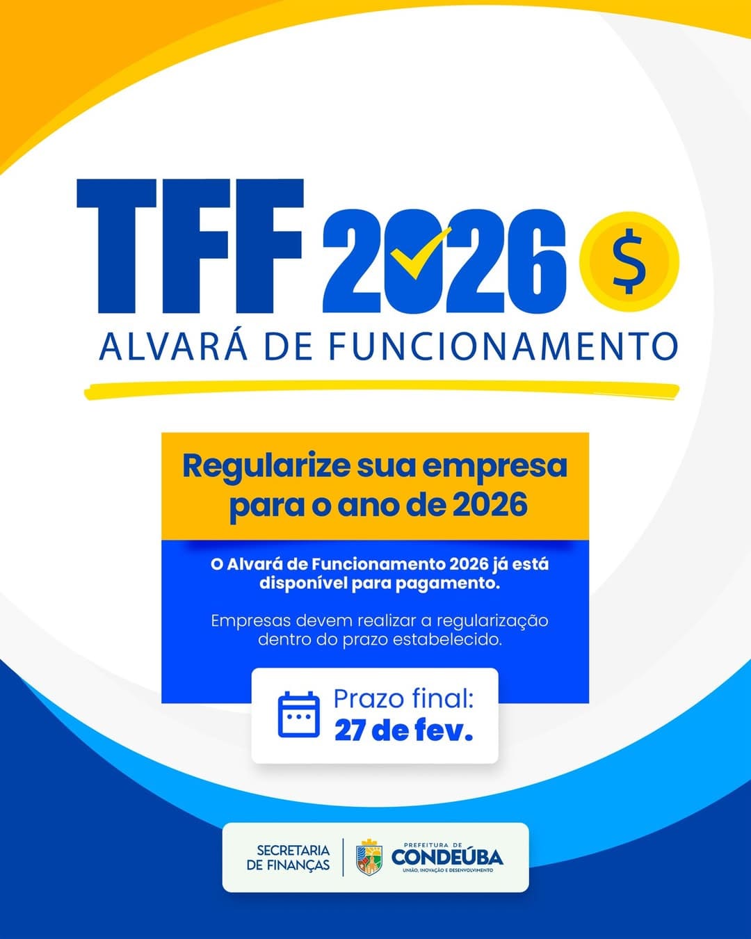 A Prefeitura de Condeúba, por meio da Secretaria Municipal de Finanças, informou que já está disponível para pagamento a Taxa de Fiscalização de Funcionamento (TFF) 2026, referente ao Alvará de Funcionamento das empresas instaladas no município.