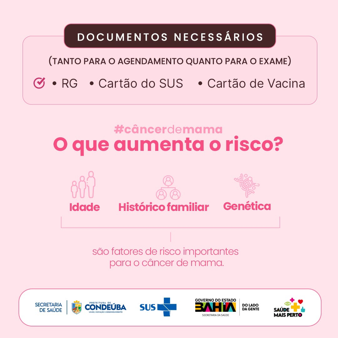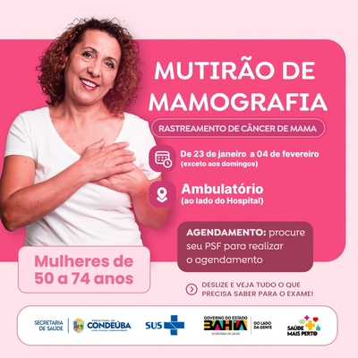 :A Prefeitura de Condeúba está promovendo um importante Mutirão de Mamografia, reforçando o compromisso com a saúde da mulher e a prevenção do câncer de mama. A iniciativa tem como foco principal mulheres com idade entre 50 e 74 anos, faixa etária considerada prioritária para o rastreamento da doença.