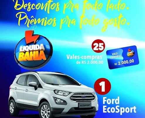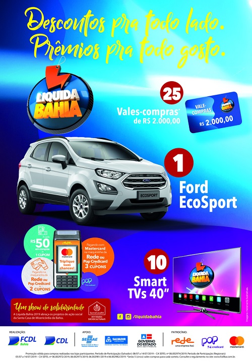 Do dia 05 a 14 de julho acontece a Liquida Bahia 2019, uma das principais campanhas do varejo estadual. A Liquida reúne lojas de shoppings e do comércio de rua de Salvador e cidades do interior e vai sortear um Eco Sport, 25 vales-compras no valor de R$ 2.000,00 e 10 smart TVs de 40″, além de prêmios para os vendedores. Serão dez dias de promoção.