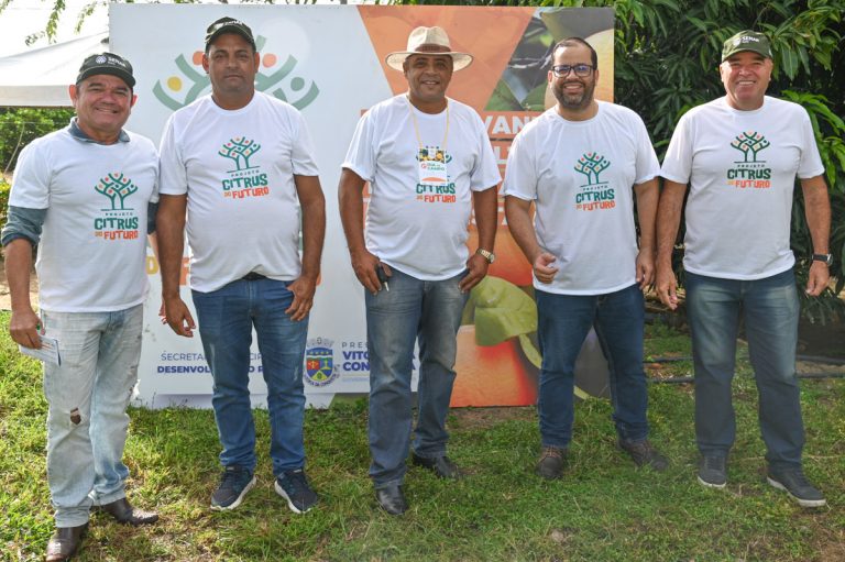 Nesta quinta-feira (22), a Prefeitura de Vitória da Conquista, por meio da Secretaria Municipal de Desenvolvimento Rural (SMDR), realizou a segunda edição do Dia de Campo do Projeto “Citrus do Futuro”, na Fazenda Bom Retiro. O evento, que visa fortalecer a citricultura local e impulsionar o desenvolvimento agrícola da região, contou com a presença da prefeita Sheila Lemos, dos vereadores Adinilson Pereira, Ricardo Babão, Subtenente Muniz e Nelson de Vivi, além de autoridades municipais e estaduais, produtores rurais e técnicos do setor.